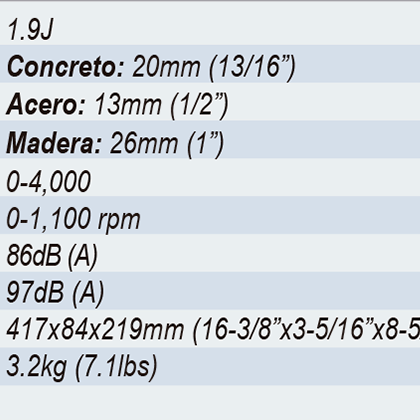 - 3 Modos de operación «Percusión con rotación»,»solo percusión»,»solo rotación».