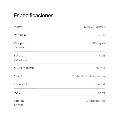 La motobomba Power Hunt modelo HUNT521 es de uso exclusivo agrícola, fácil de transportar y utilizar. Su motor de 2.5 caballos de fuerza y de 2 tiempos OHV, generan 7000 revoluciones por minuto, lo que permite generar una altura de descarga de hasta 35 metros. Está construida con materiales de calidad y es ensamblada bajo lo más rigurosos estándares de producción.